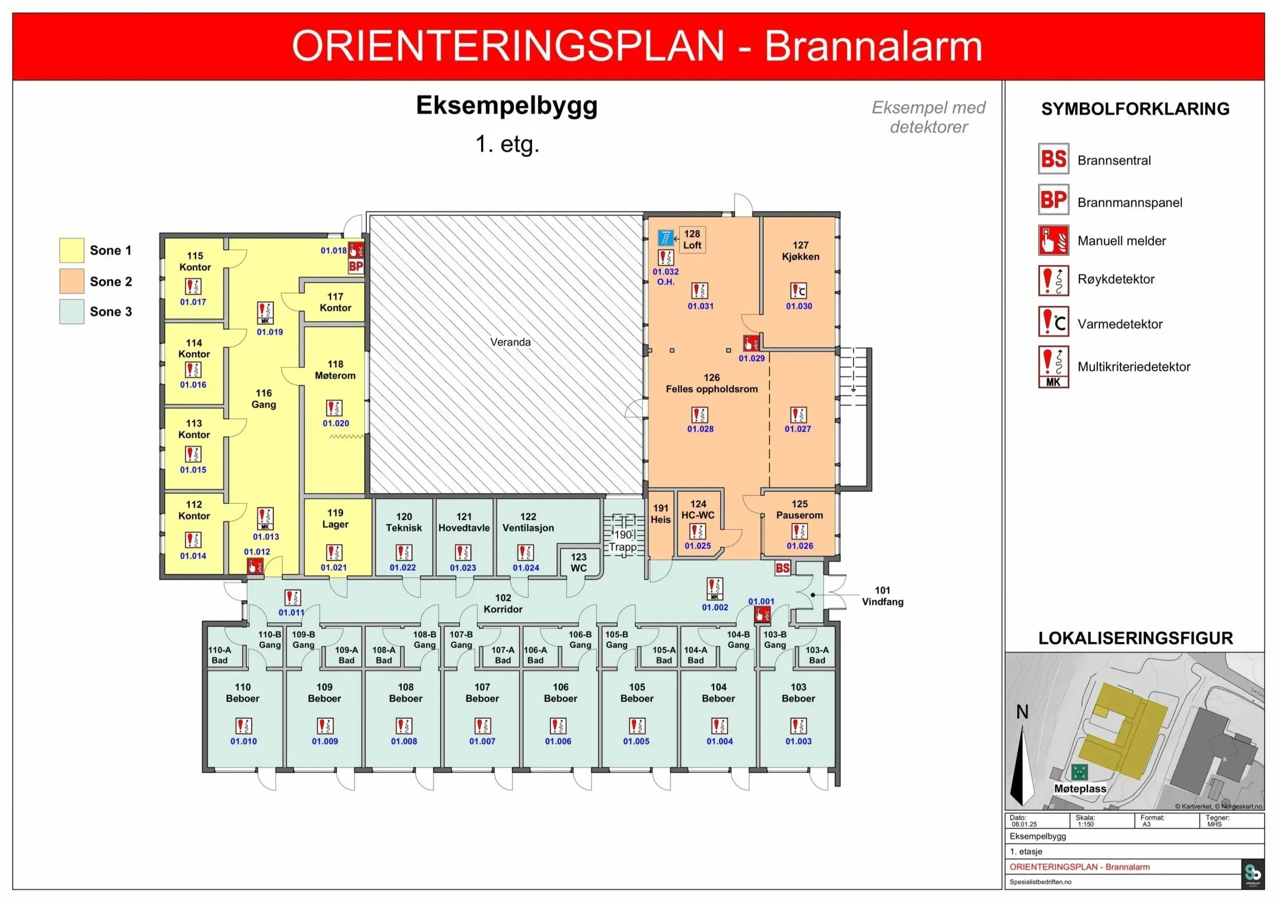 Vi kan både oppdatere og forbedre eksisterende orienteringsplaner, eller lage helt nye fra bunnen av basert på plantegninger. Vi tegner inn alle viktige komponenter i brannalarmanlegget, og kan lage etasjeoversikter i 2D med tydelig merking av soner, detektorer og øvrige viktige elementer. Resultatet er en oversiktlig og korrekt orienteringsplan som oppfyller kravene og gir trygghet for både brukere og brannvesenet.